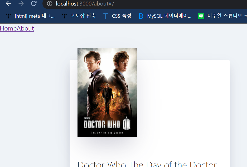 - localhost:3000/# 에 path에 지정했던 /about을 입력하면 About 컴포넌트가 불러지면서 내용이 출력됩니다.