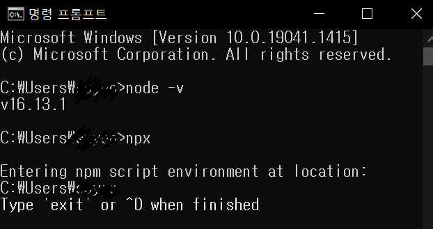 1. nodejs를 다운받은 후, cmd창에 node -v 와 npx 입력하기