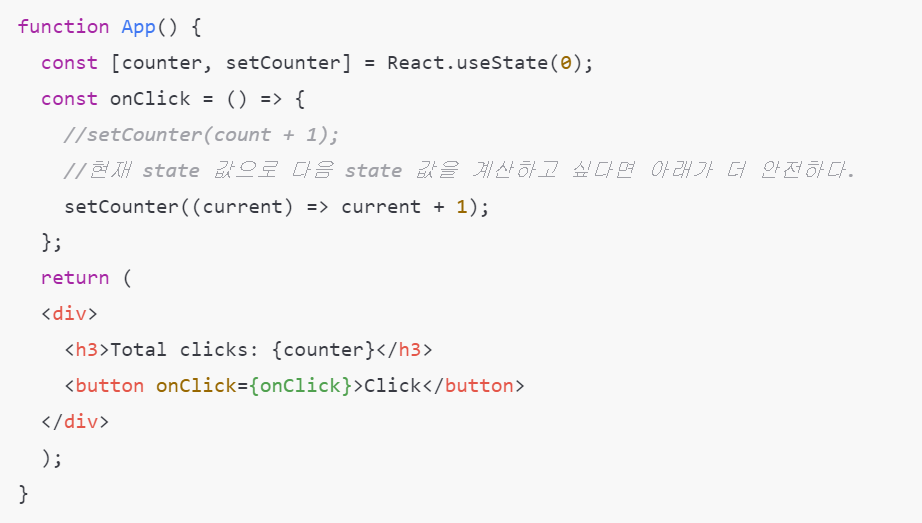 React state 사용 방법 #1. 숫자 1씩 증가시키기 function App() { const [counter, setCounter] = React.useState(0); const onClick = () => { //setCounter(count + 1); //현재 state 값으로 다음 state 값을 계산하고 싶다면 아래가 더 안전하다. setCounter((current) => current + 1); }; return ( Total clicks: {counter} Click ); } React.render(, 넣을 곳); - setCounter은 counter += 1, React.render(, 넣을 곳) 역할을 동시에 해줍니다. #2. 분을 시간으로 바꾸기 function App() { let [minutes, se.. React JS 2022.02.06