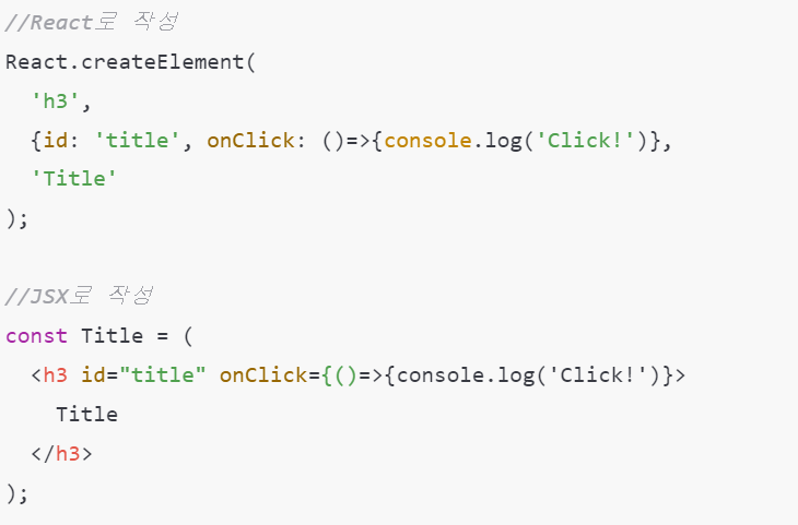 JSX 출처 : 노마드코더 - ReactJS로 영화 웹 서비스 만들기 JSX 란 - JavaScript를 확장한 문법입니다. - 모습은 HTML과 유사합니다. 그래서 JSX로 React 요소를 만드는 게 개발자들 입장에서 굉장히 편합니다. - React.createElement() 는 많이 사용하지 않는 편입니다. 봤을 때 JSX보다 이해하기 어렵기 때문입니다. - JSX의 변수는 대문자로 시작합니다. 소문자로 적어서 HTML의 태그와 헷갈리면 안 되기 때문입니다. //React로 작성 React.createElement( 'h3', {id: 'title', onClick: ()=>{console.log('Click!')}, 'Title' ); //JSX로 작성 const Title = ( {console.lo.. React JS 2022.02.06